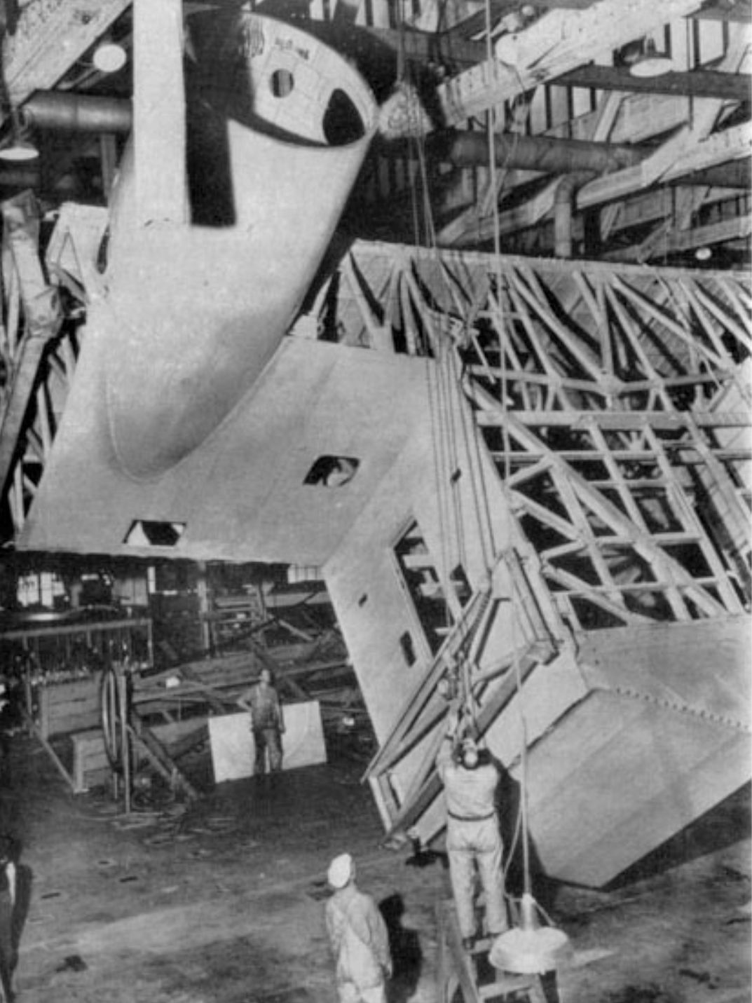 The tail assembly, or empennage, would need much more lateral authority. What started as a single tail quickly went through a two-stage evolution. Boeing B-314 center wing section being positioned during construction. Photo: Honolulu Clipper.